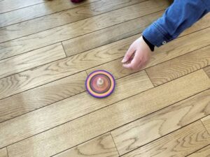 コマ回しチームは誰が一番長く回っているか対決!